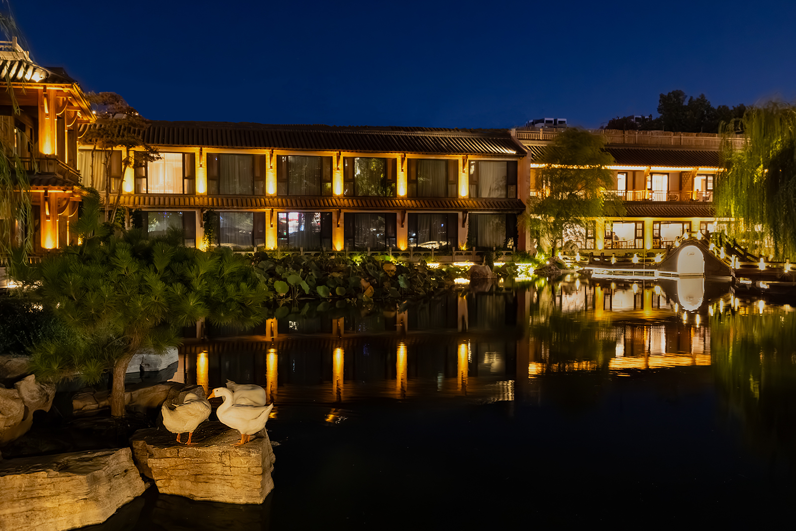 夜晚的舜庐人家,灯火辉煌。荷塘悠悠,小桥流水,静谧安宁。几只白鹅悠闲地伫立石上,梳妆打扮,相互依偎。一派岁月静好。