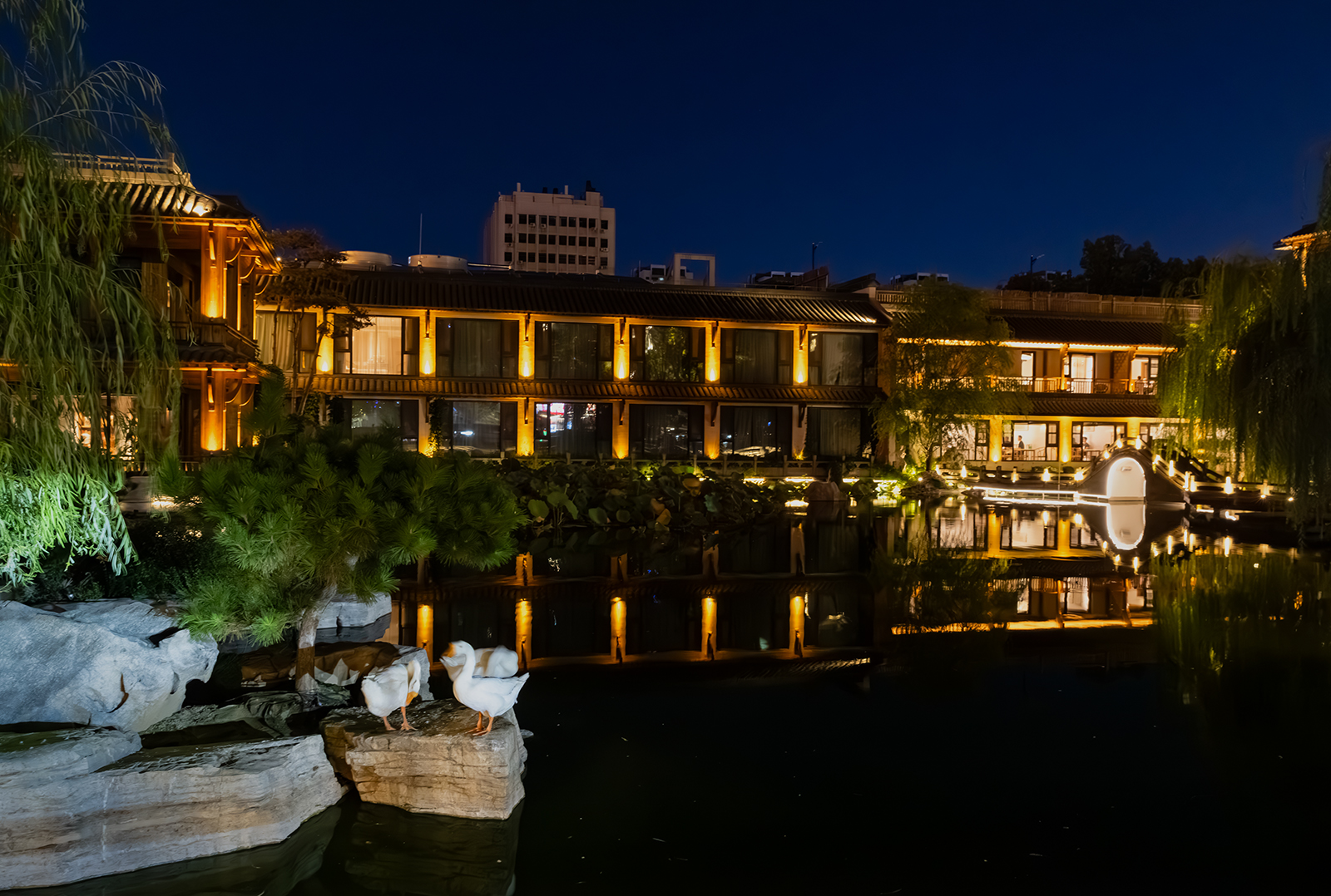 夜晚的舜庐人家,灯火辉煌。荷塘悠悠,小桥流水,静谧安宁。几只白鹅悠闲地伫立石上,梳妆打扮,相依相伴。